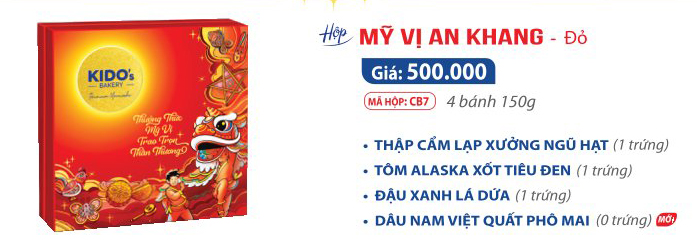 7, Hộp bánh trung thu cao cấp Kido - MỸ VỊ AN KHANG đỏ: giá 500.000 VNĐ gồm 4 bánh x 150gr