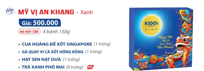 6, Hộp bánh trung thu cao cấp Kido - MỸ VỊ AN KHANG xanh: giá 500.000 VNĐ gồm 4 bánh x 150gr