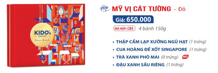 4, Hộp bánh trung thu cao cấp Kido - MỸ VỊ CÁT TƯỜNG đỏ: giá 650.000 VNĐ gồm 4 bánh x 150gr