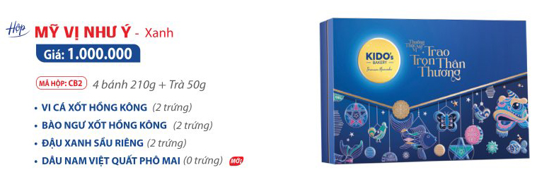 3, Hộp bánh trung thu cao cấp Kido - MỸ VỊ NHƯ Ý xanh: giá 1.000.000 VNĐ gồm 4 bánh x 210gr + 1 hộp trà 50GBao gồm 4 hương vị