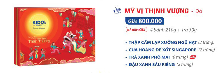 2, Hộp bánh trung thu cao cấp Kido - MỸ VỊ THỊNH VƯỢNG đỏ: giá 800.000 VNĐ gồm 4 bánh x 210gr + 1 hộp trà 30G