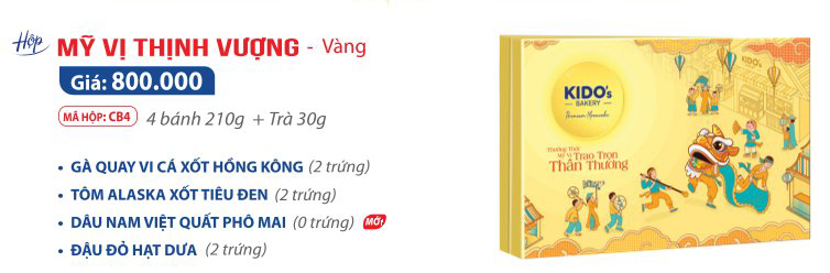 3, Hộp bánh trung thu cao cấp Kido - MỸ VỊ THỊNH VƯỢNG vàng: giá 800.000 VNĐ gồm 4 bánh x 210gr + 1 hộp trà 30G