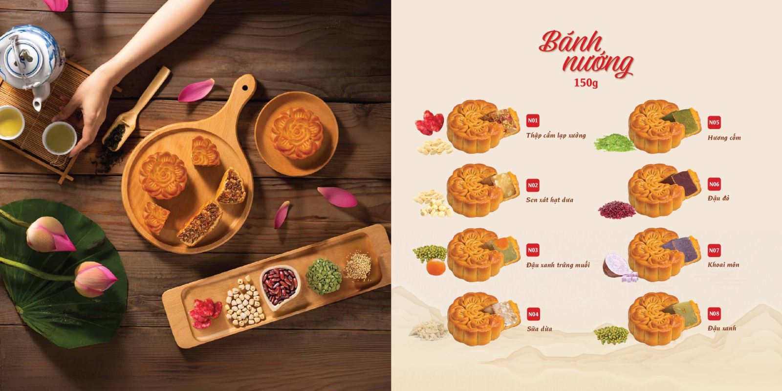 Có 2 mẫu hộp: Hình Thang 4 Bánh & Chữ Nhật 2 Bánh. Khách hàng lựa chọn các loại nhân bánh trung thu theo khẩu vị và sở thích của cả gia đình